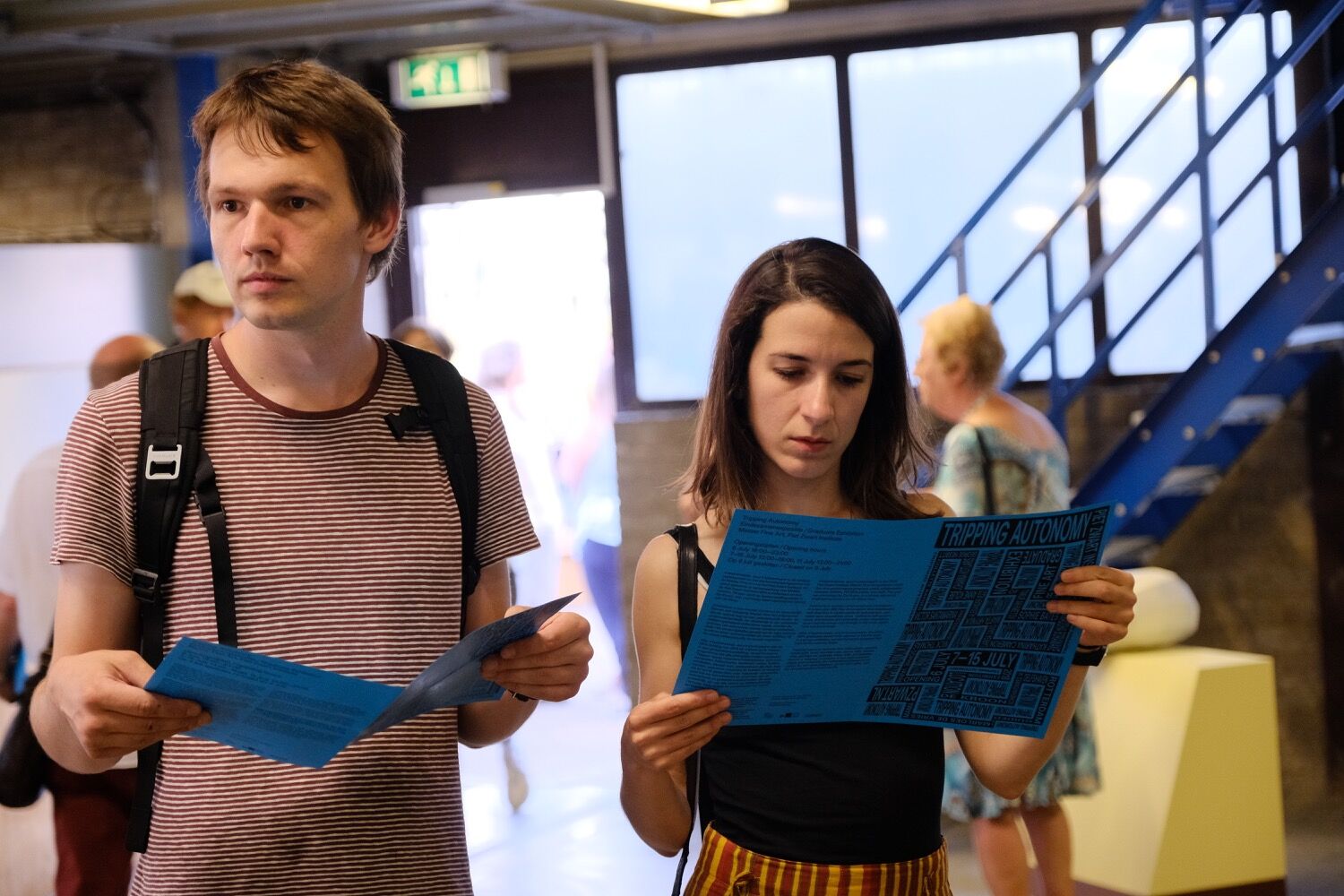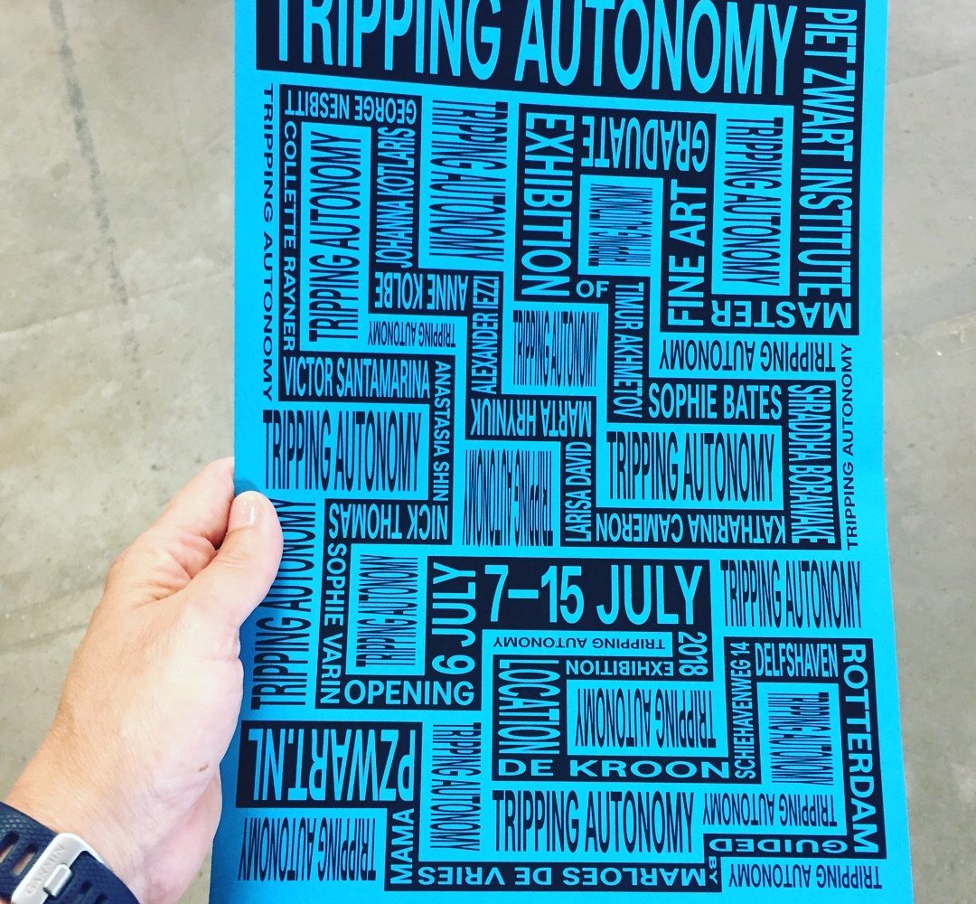 Tripping Autonomy is the title of the 2018 Piet Zwart Institute Master Fine Art graduate exhibition and performance program, and a collaboration between MAMA, platform for visual culture in Rotterdam, PZI MFA artists, and staff, guided by MAMA curator Marloes de Vries. Featuring: Timur Akhmetov, Sophie Bates, Shraddha Borawake, Katharina Cameron, Larisa David, Marta Hryniuk, Alexander Iezzi, Anne Kolbe, Johanna Kotlaris, George Nesbitt, Collette Rayner, Victor Santamarina, Anastasia Shin, Nick Thomas, and Sophie Varin.